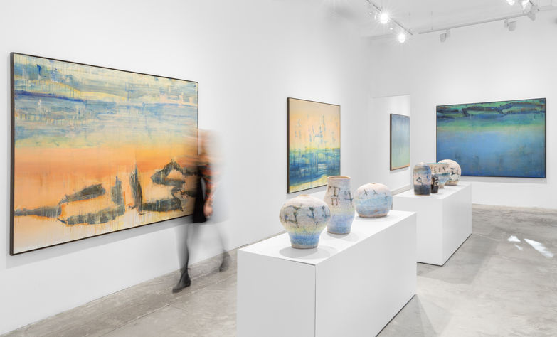 two mediums, a conversation between paint and clay. This concept is further extended with ceramics becoming part of an installation context, including sculptural forms embedded with ceramic shards.