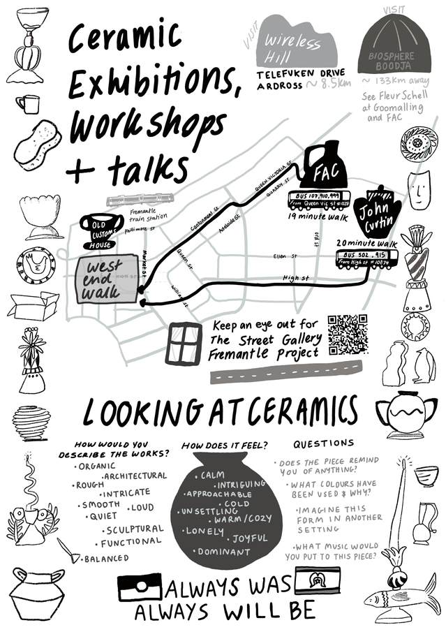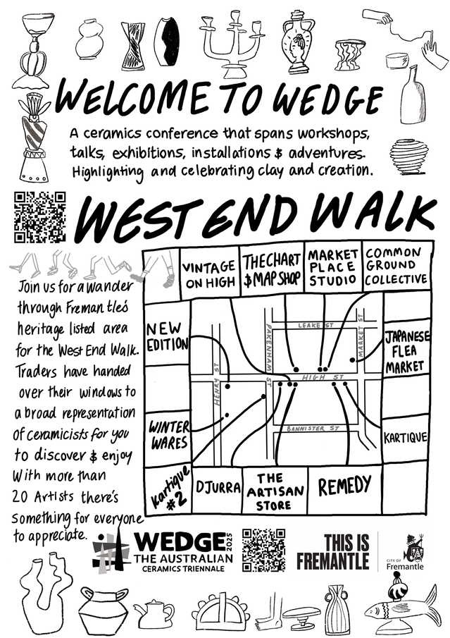 Fremantle’s World Heritage Listed West End provides a dramatic backdrop to the creative businesses within its streets whose windows come to life as they host the creations of W.A.’s talented ceramicists. Follow the West End Walk as you journey from one WEDGE event to the next - or visit late at night when the streets are quiet - to enjoy this sidewalk gallery collaboration between these treasured artists and businesses. It may be a retail space, a hair salon or a ceramicists tiny atelier – this walk takes in a variety of forms and contributors. We invite you to wander and interact with these spaces while enjoying this unique environment.